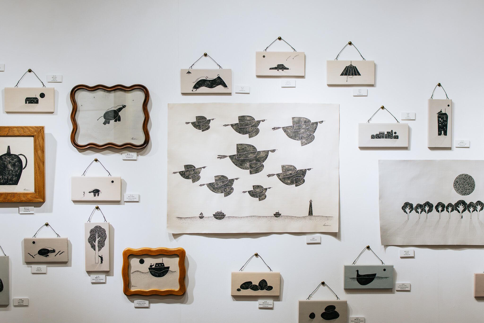 木の温もりが感じられるパネルの質感と、そこにのせられた繊細な筆致。原画だからこそ伝わってくる絵具の重なりが、平面を越えてその場の空気をふんわりと変えてくれます。