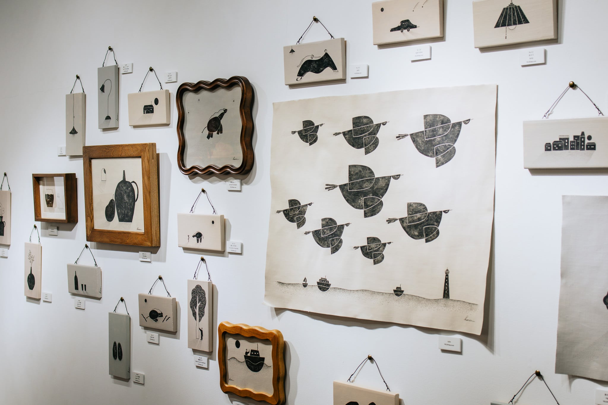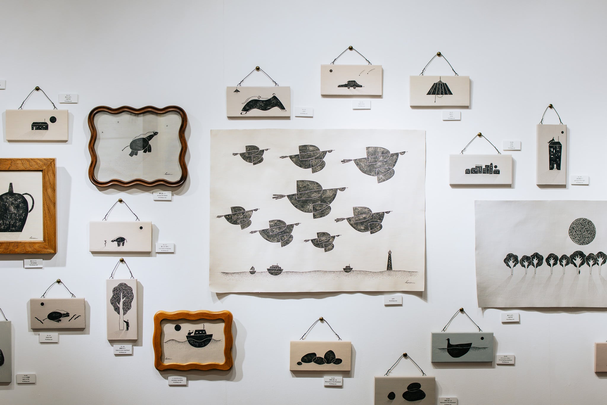繊細な筆致と原画だからこそ伝わってくるインクや絵の具の重なりが、平面を越えてその場の空気をふんわりと変えてくれます。